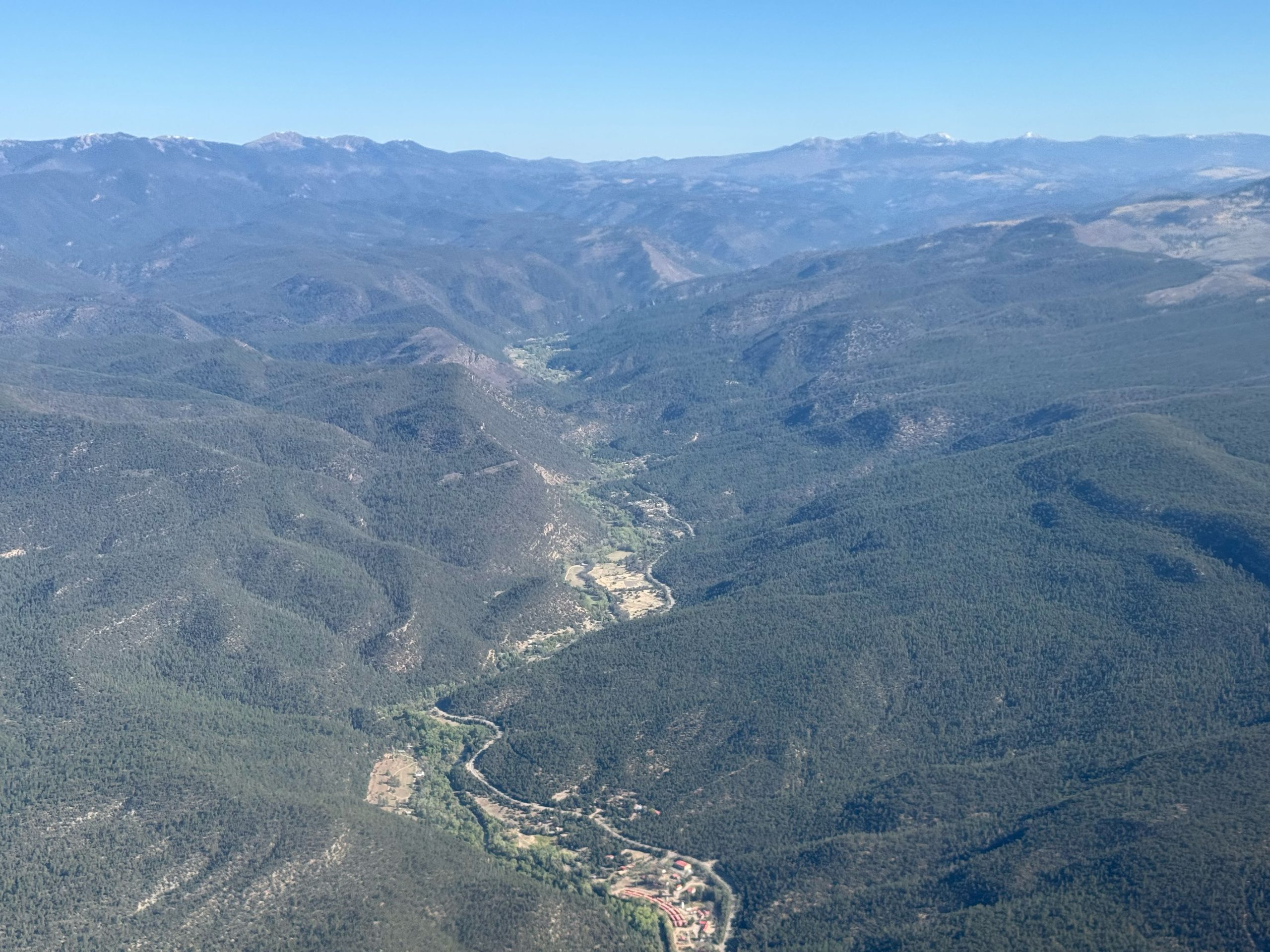 An aerial view up the Pecos Canyon, where the river, communities, forests, and surrounding backcountry are all tightly linked.