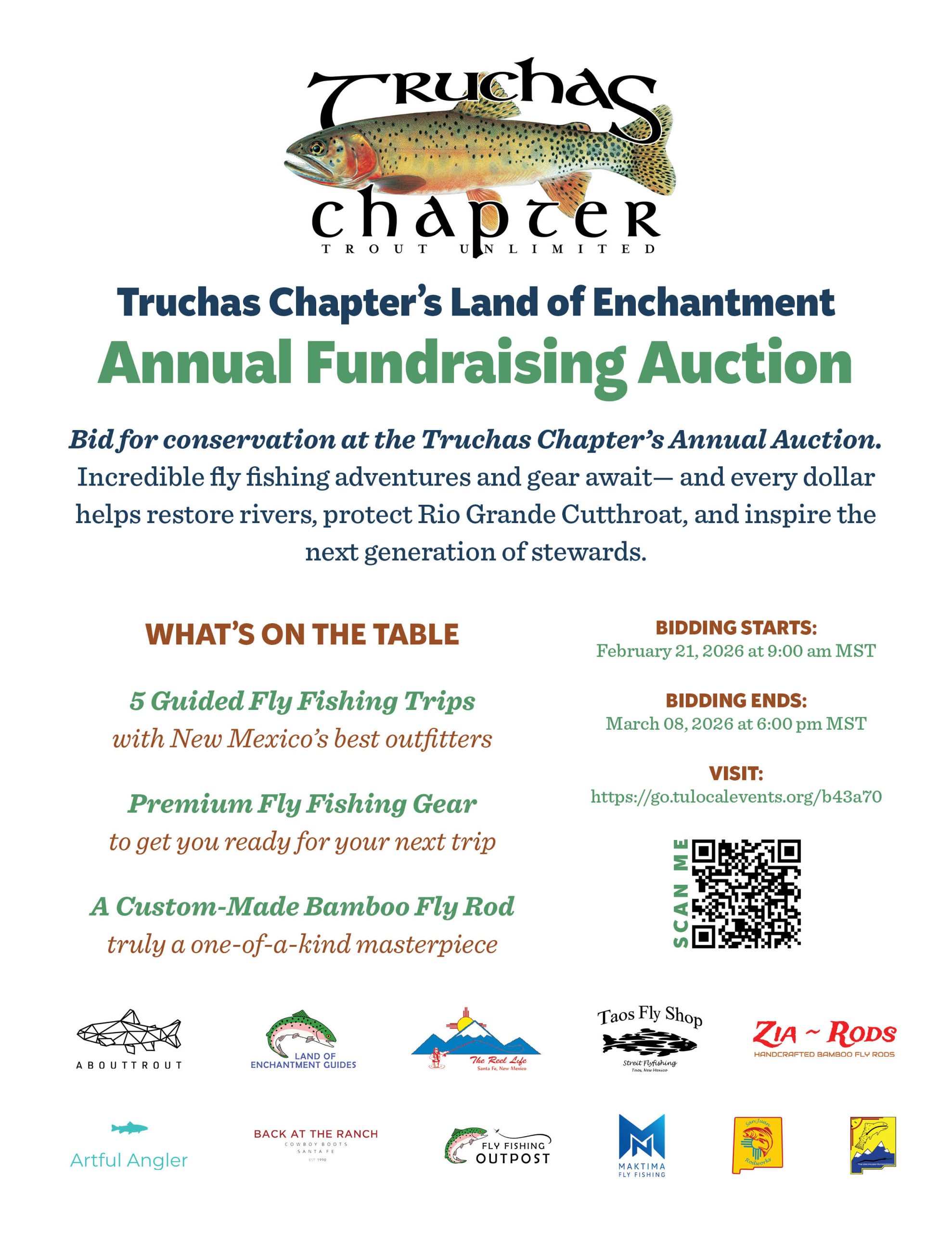 The Truchas Chapter’s Annual Fundraising Auction is your chance to reel in unforgettable guided fly fishing adventures, premium gear, and a handcrafted bamboo fly rod — all while powering real conservation across northern New Mexico. Every bid supports Rio Grande Cutthroat restoration, watershed projects, youth education, Indigenous and Hispanic Youth Fishing Camps, and our annual STEM scholarship. Bid boldly and help keep wild, cold-water fisheries thriving for generations.