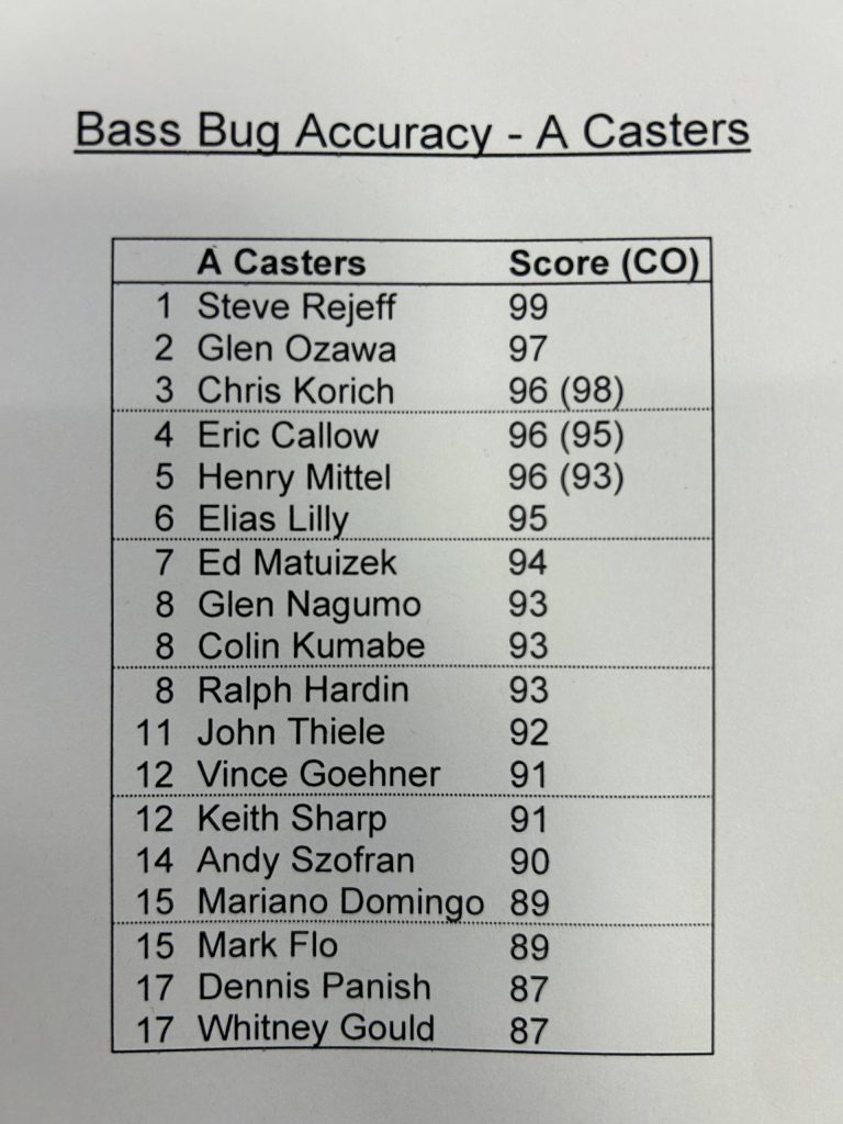 Other accuracy events include Trout Accuracy (an international version), Dry Fly and Bass Bug. My big excitement was to find myself in competition with two long time champion casters for a third-place medal in the Bass Bug game. While I ended up fourth, the result was a very gratifying outcome of long-term effort. I will be back.